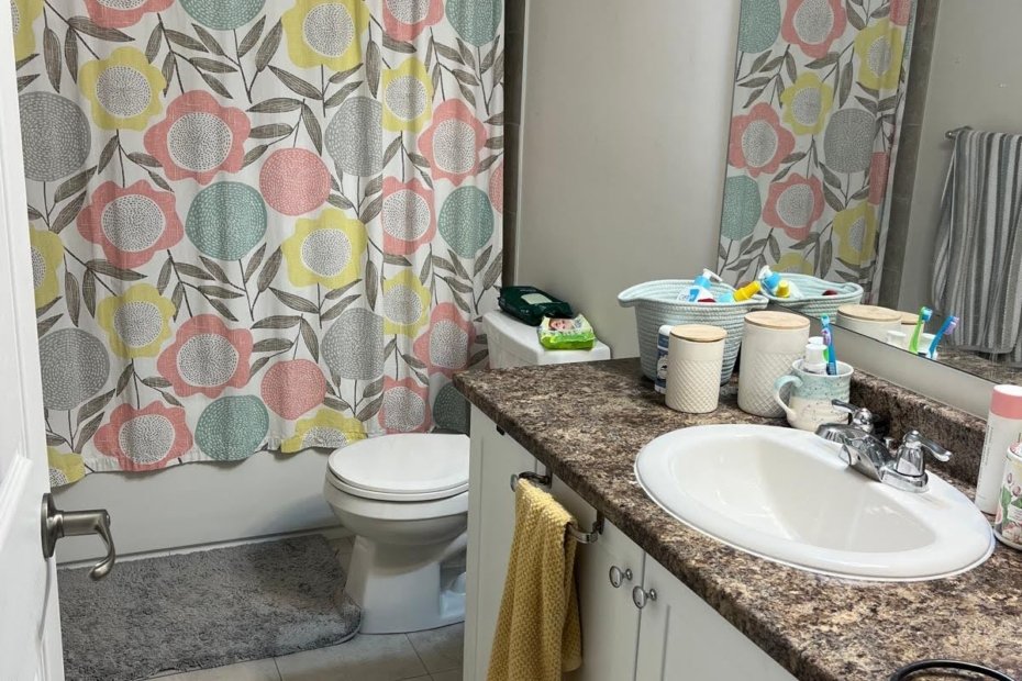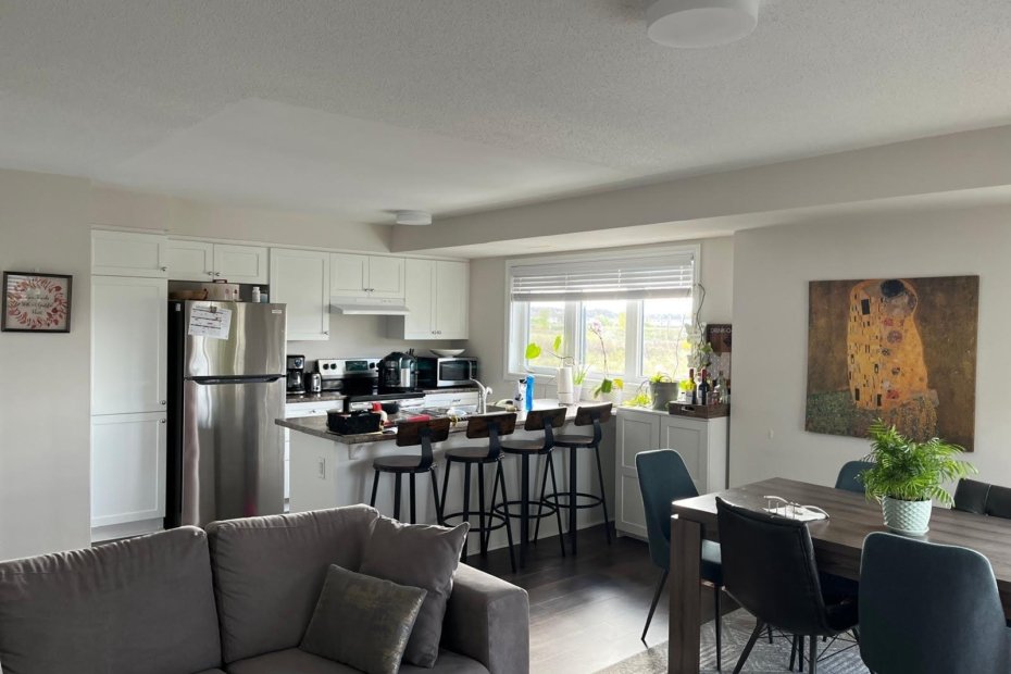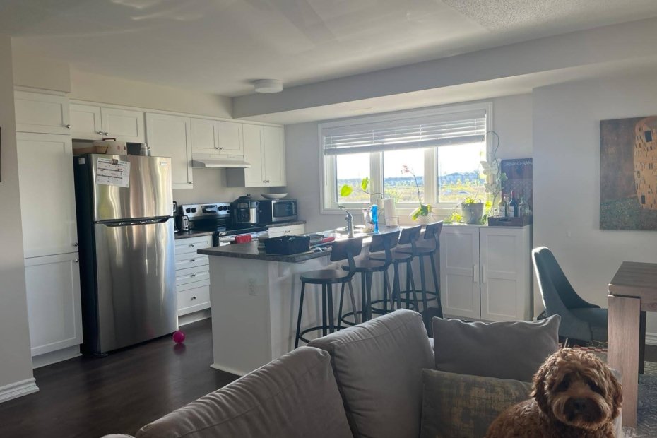 Kitchen, laundry, bathroom, half-bath, and dining room are shared with a mother, her 8-year-old son, and a small dog.